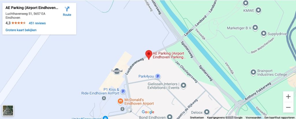 Vanaf de N2 (ringweg Eindhoven) neemt u afslag “Eindhoven Airport”. Daarna volgt u de borden richting P5 (vanaf de Anthony Fokkerweg rechtsaf naar de Spottersweg, daarna linksaf de luchthavenweg op). Op de Luchthavenweg rijdt u het eerste kruispunt voorbij. Onze parking is 50 meter verder aan de linkerzijde. Er zijn werkzaamheden aan de Luchthavenweg, maar wij zijn gewoon bereikbaar.